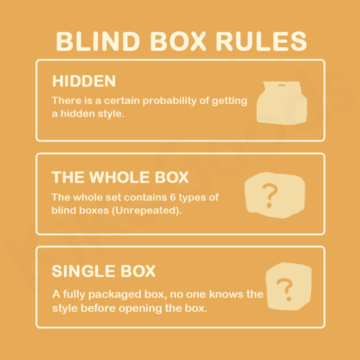 6. Buying Tips: When you purchase multiple A Blind Box options at the same time, we cannot guarantee that you will receive non-repeating styles. If you’d like to get non-repeating styles of the product, we recommend the purchase option of Set Of 6 or Set Of 3. Thank you for your understanding.